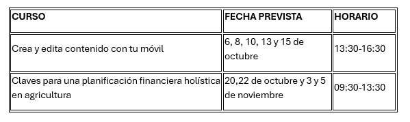 Respaldiza acogerá dos formaciones adaptadas a sectores estratégicos de la comarca. Por un lado, el taller de Planificación financiera holística en la agricultura, enfocado a la sostenibilidad y la toma de decisiones en entornos rurales y la formación Crea y edita contenido con tu móvil, orientada al desarrollo de habilidades digitales prácticas.