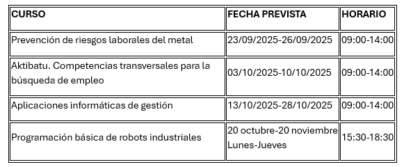 Amurrio Bidean ha organizado cuatro cursos, de los cuales tres se impartirán en Amurrio. Uno de ellos es el programa Aktibatu, dirigido a personas desempleadas en búsqueda activa de empleo, con posibilidad de continuar su itinerario en el programa Hazilan+, que ofrece prácticas becadas en empresas. También se ofrecerá la formación en Prevención de Riesgos Laborales del Metal, así como dos cursos de contenido técnico y digital: Aplicaciones informáticas de gestión y Programación básica de robots, este último impartido en el instituto Laudioalde.