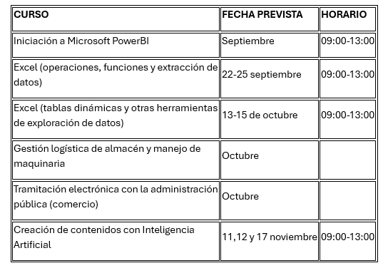 En Llodio se desarrollarán seis formaciones centradas en herramientas digitales, administrativas y logísticas: dos niveles de Excel (básico y avanzado con tablas dinámicas), Iniciación a Microsoft Power BI, Tramitación electrónica con la administración pública (sector comercio) y un taller de Creación de contenidos con Inteligencia Artificial, una temática que sigue generando gran interés. También se impartirá el curso de Gestión logística de almacén y manejo de maquinaria (Llodio), muy vinculado a la empleabilidad local.